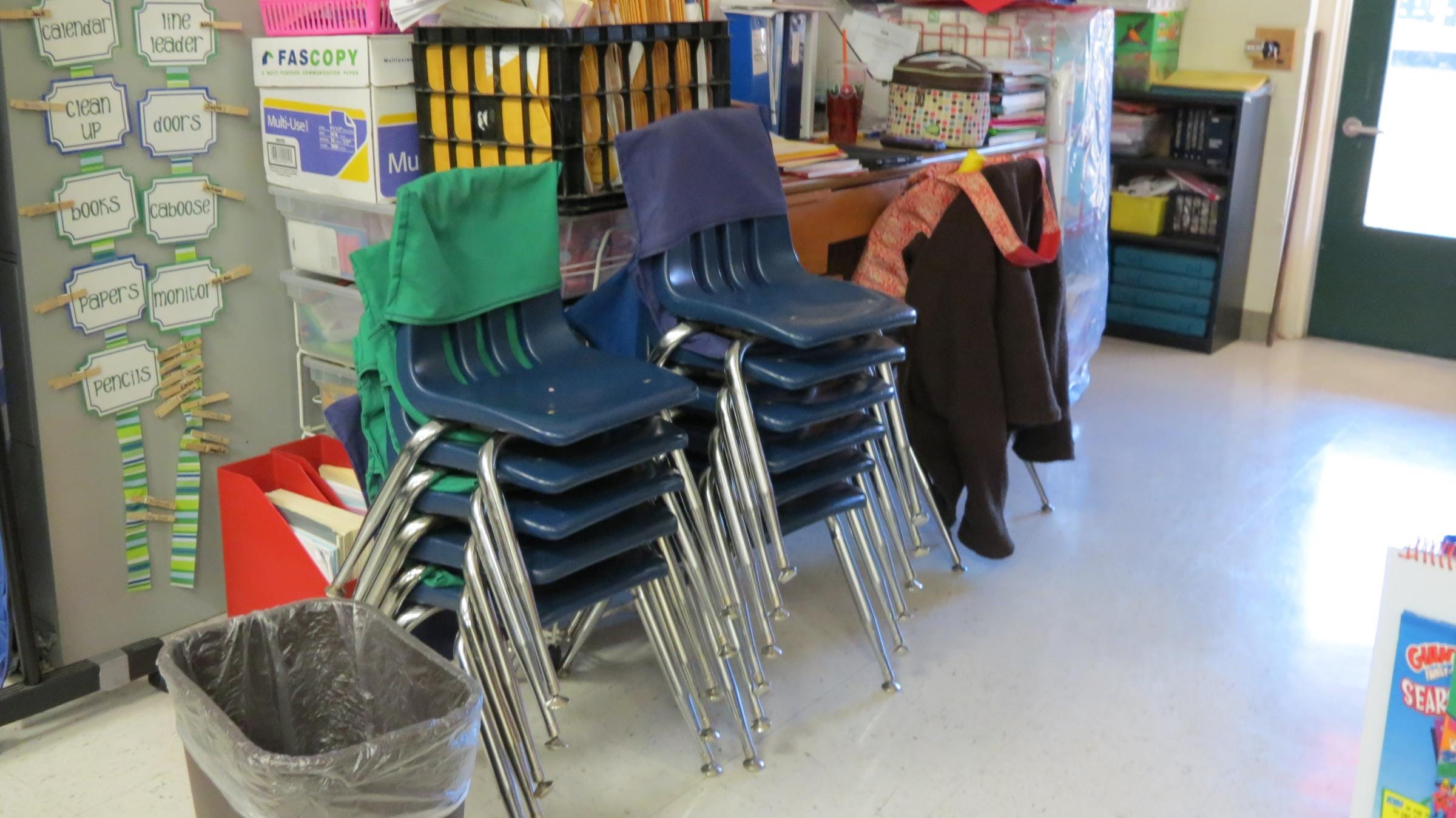 However to throw a spanner in the works came the order from above that the chairs now had to be stacked at the end of the day. This of course caused confusion - should they be put on desks or stacked separately...this had to be planned !